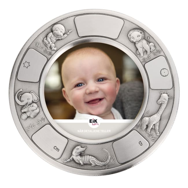 Bilderamma i tinn. Kan graverast med alle dåpsdata, ta kontakt med butikken for meir info. Diameter:18 cm