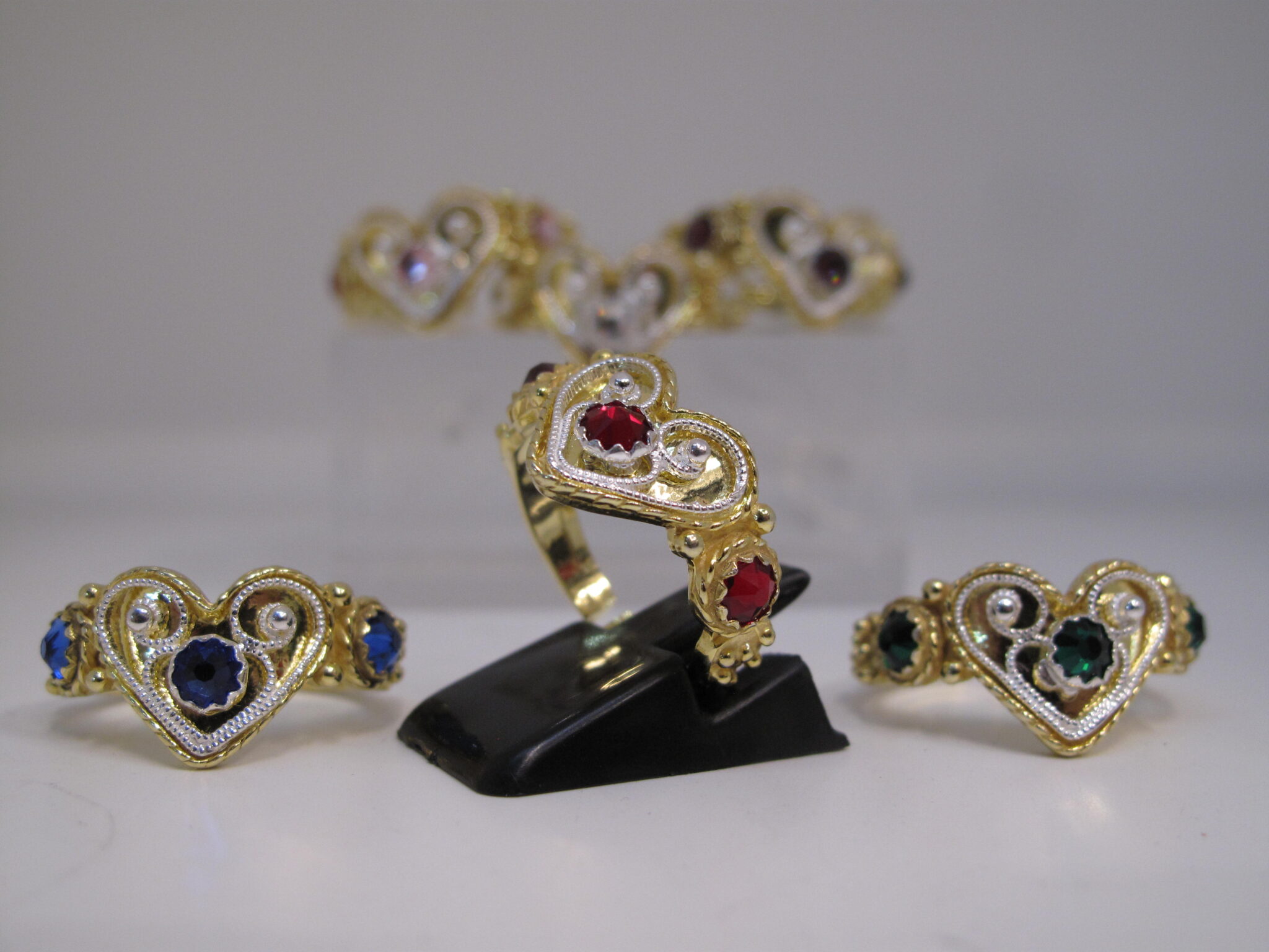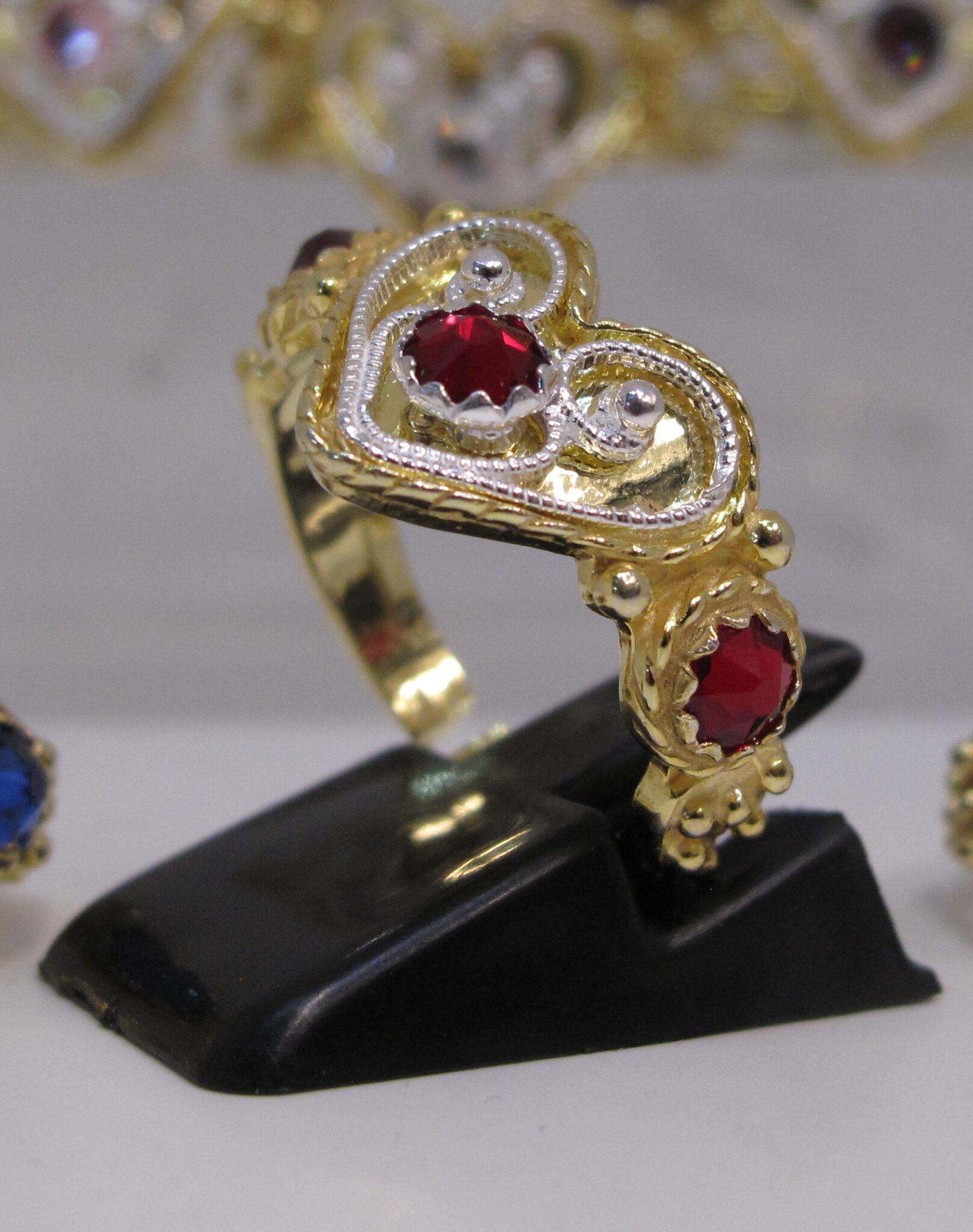 Ring, m/filigran og raud stein
